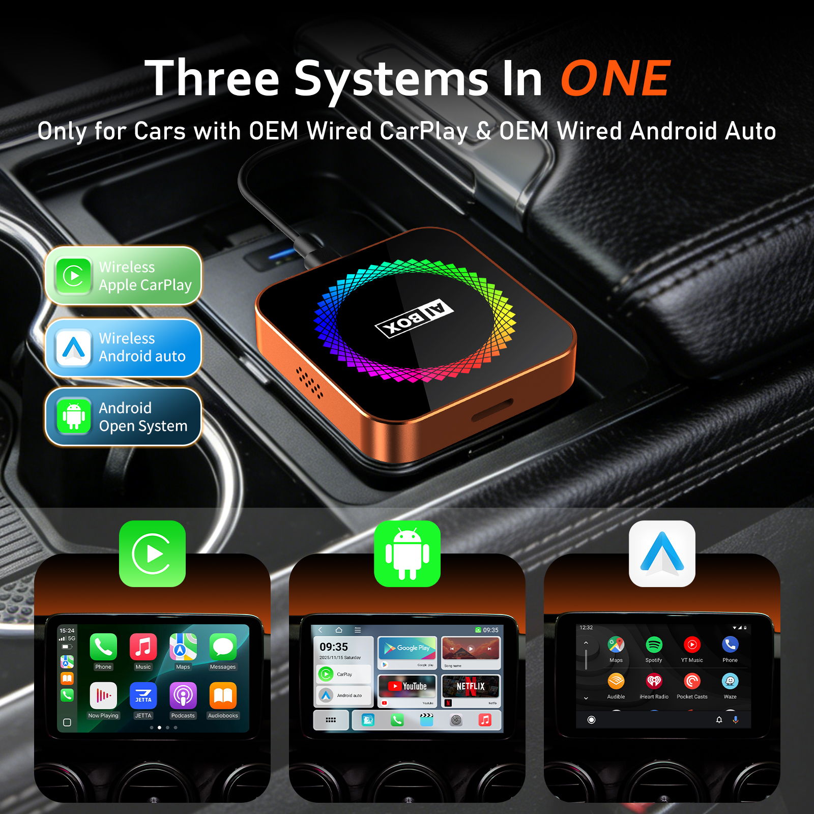 3-in-1 YouTube/Netflix & wireless Apple CarPlay & Wireless Android Auto Adapter