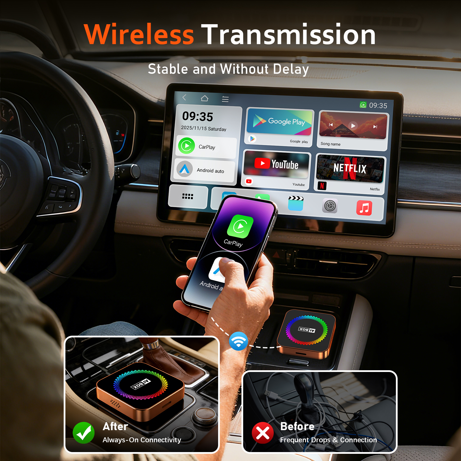 3-in-1 YouTube/Netflix & wireless Apple CarPlay & Wireless Android Auto Adapter