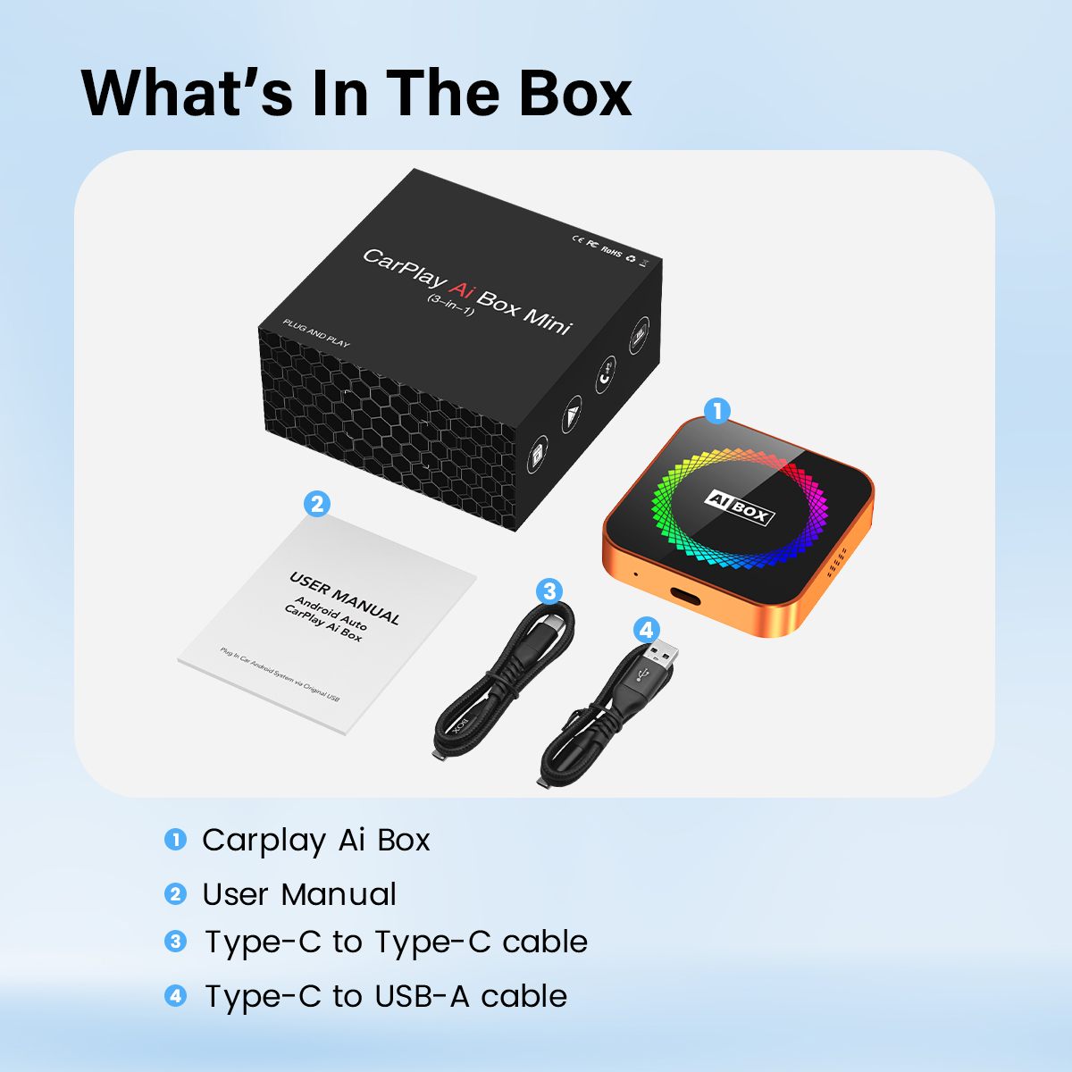 1. Car Smart Box 2. Type C-Type C cable 3. Type C-USB-A cable |